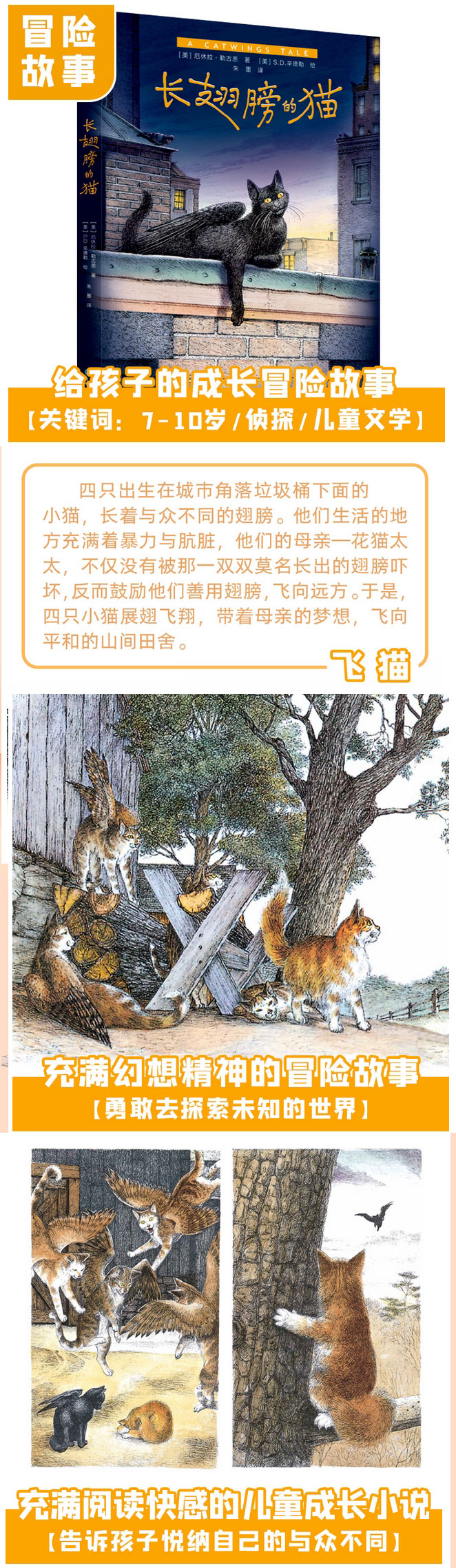 《飞猫》:四只出生在城市角落垃圾桶下面的小猫,长着与众不同的翅膀。他们生活的地方充满着暴力与脏乱,他们的母亲——花猫太太,不仅没有被那一双双莫名长出的翅膀吓坏,反而鼓励他们善用翅膀,飞向远方。于是,四只小猫展翅飞翔,带着母亲的梦想,飞向平和的山间田舍。 《飞猫归来》:飞离城市的四只小猫,在农场自在的生活中思念起城市里的母亲,于是,两只小猫打算飞回城市去探望母亲。怎料他们出生的家——垃圾桶被移走了,附近的房屋正遭受破坏,在残垣瓦砾中,他们和同父异母的妹妹——一只长翅膀的黑猫相遇,并一起寻找失散的母亲,短暂的相聚后,两只小猫带着妹妹再次奔向安定的农场。 《了不起的亚历山大与飞猫》:亚历山大是一只生活无忧无虑且非常自大的猫,一天,他离家出走了,要去看看广大的世界。一路上惊险重重,当他被恶狗追逐,蹿上树梢,在高高的树上打着哆嗦,进退两难之际,长着翅膀的小黑飞猫简伸出了援手。亚历山大也因此结识了飞猫们,同时,亚历山大也发挥了他了不起的本领,帮助简克服梦魇,开口说话。 《简的独自冒险》:小黑飞猫简厌倦了农场的生活,她想要独自冒险飞回城市,寻找不一样的生活。飞行倦怠之际,简闯入了老爹的生活,简以为找到了好的归属,但老爹只是把她当作赚钱的工具。聪明的简伺机而动,终于离开了老爹的樊笼,当她来到母亲生活的地方,才真正找到了自己的归属。 适读年龄: 7—9岁自主阅读