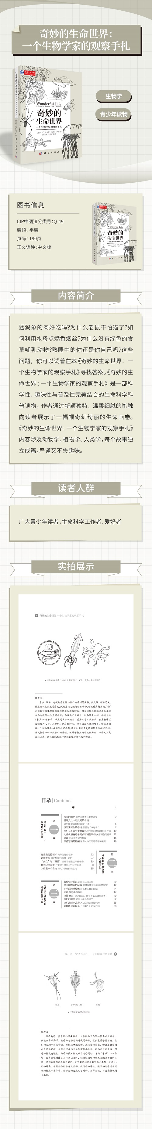 猛犸象的肉好吃吗?为什么老鼠不怕猫了?如何利用水母点燃香烟丝?为什么没有绿色的食草哺乳动物?熟睡中的你还是你自己吗?这些问题,你可以试着在本书中寻找答案。《奇妙的生命世界:一个生物学家的观察手札》是一部科学性、趣味性与普及性完美结合的生命科学科普读物,作者通过新颖独特、温柔细腻的笔触向读者展示了一幅幅奇幻绮丽的生命画卷。本书内容涉及动物学、植物学、人类学,每个故事独立成篇,严谨又不失趣味。