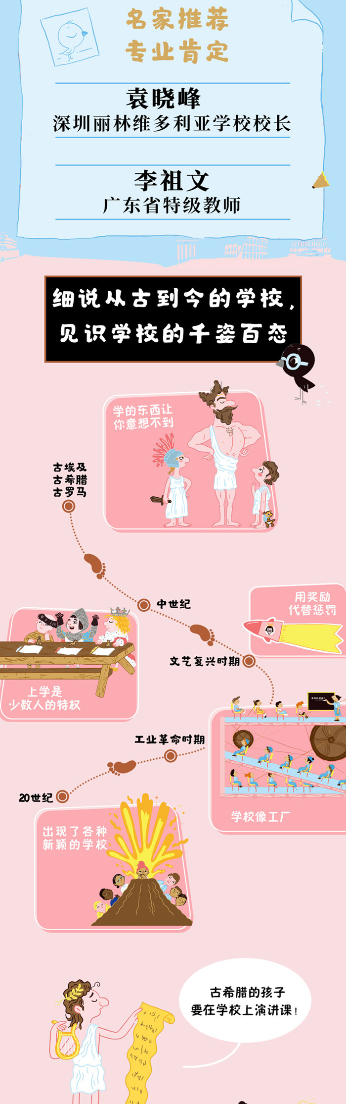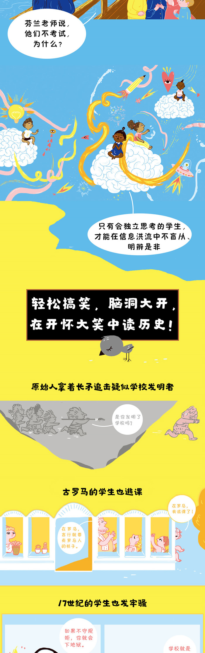 ★细说学校的前世今生,介绍从史前时代到21世纪的学校发展,让孩子见识千姿百态的学校。 ★轻松搞笑,脑洞大开,诸多漫画描绘有趣的学校场景,让孩子在开怀大笑中读历史。 ★探讨孩子想问不敢问的教育话题(一定要去学校上学吗?可以没有家庭作业和考试吗?……),呈现多元观点,鼓励孩子独立思考,做不是只会服从的学生。只有拥有独立思考能力的学生在步入社会后,才能做到在信息洪流中不盲从、明辨是非。