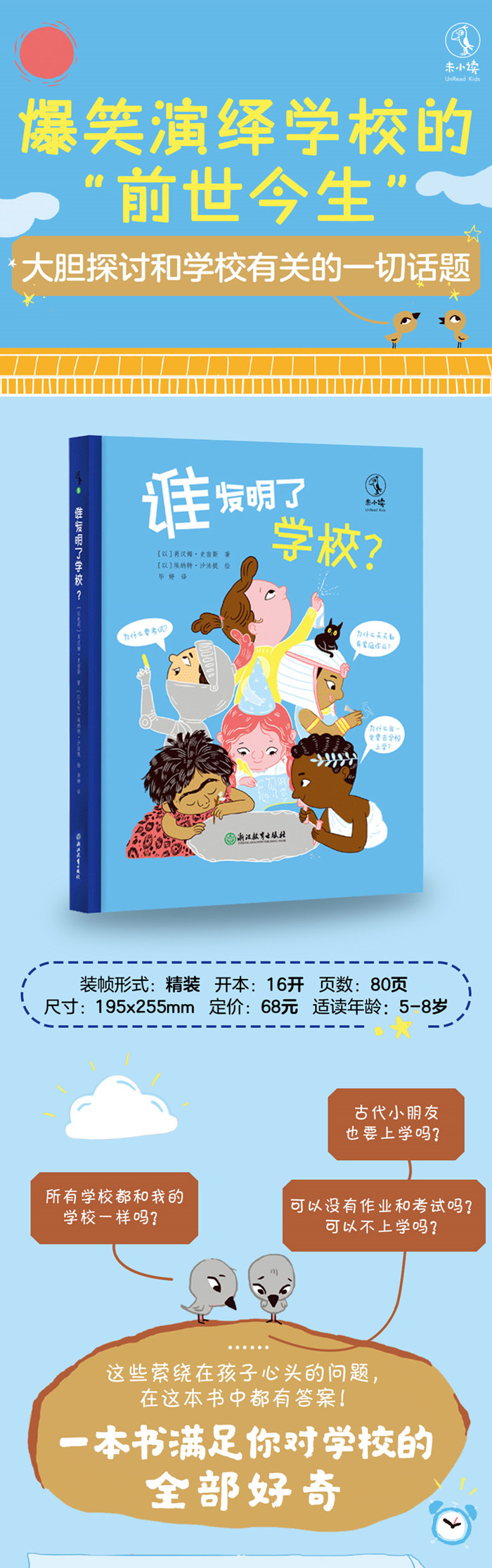 一所学校是什么样的? 古代的小朋友也要上学吗? 所有的学校都和我们上的学校一样吗? 学校是孩子们再熟悉不过的场所,但很少有书给孩子好好讲讲从古到今的学校是什么样的,世界上其他地方的学校又有什么不同。《谁发明了学校?》就是这样一本书,书中的语言极其生动诙谐,还配有丰富的图画,孩子不仅能从中了解学校的“前世今生”,还能简略了解世界历史的进程。 除了学校的历史,《谁发明了学校?》还探讨了孩子非常关心的一些问题:我们为什么要上学?我们可以没有家庭作业和考试吗?学习什么是重要的?书中没有给出标准答案,而是提供了多元的观点,鼓励孩子独立思考。