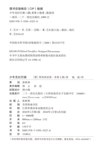 这是一本不同凡响的书,也是奥锝弗雷德·普鲁士勒先生迄今为止最好的作品。它是那样瀑张曲折,青少年读者总是一口气把它读完,而且读了还想读;成年读者也被它的艺术品位所征服,读罢大受教益。 ——《黑森评论》 《少年克拉巴德》是一部扣人心弦的杰作。