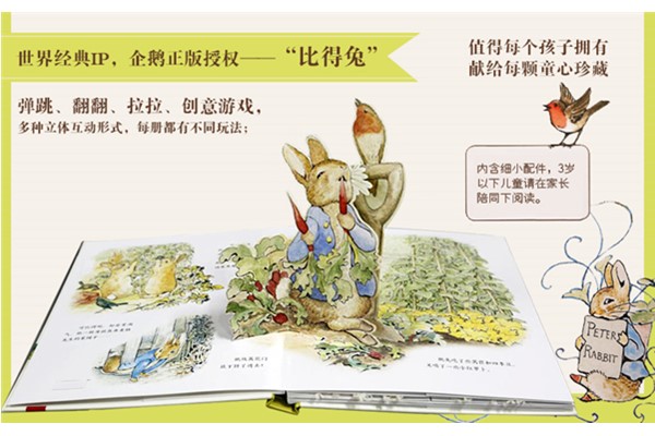 世界经典IP,企鹅正版授权——“比得兔”弹跳、翻翻、拉拉、创意游戏,多种立体互动形式,每册都有不同玩法;原版工艺,品质保证。