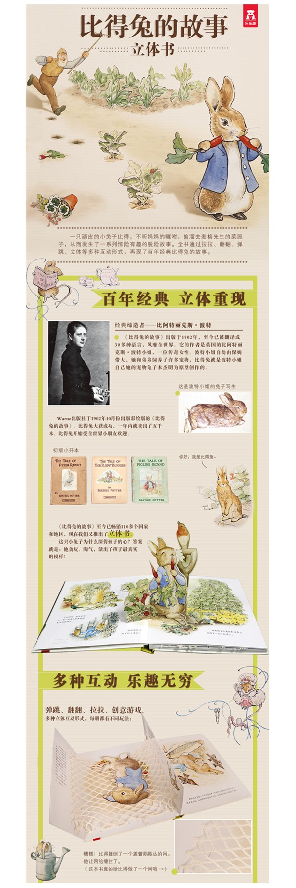 一只顽皮的小兔子比得,不听妈妈的嘱咐,偷溜去麦格先生的菜园子,从而发生了一系列惊险有趣的脱险故事。全书通过拉拉、翻翻、弹跳、立体等多种互动形式,再现了百年经典比得兔的故事。波特小姐笔下的动物世界充满爱与美德,童趣与智慧相伴左右,极为贴近孩子的内心世界,孩子会亲密地把这些故事中的主人公当成自己的小伙伴,在故事中找寻自己的影子,并在读故事的过程中学习和成长。