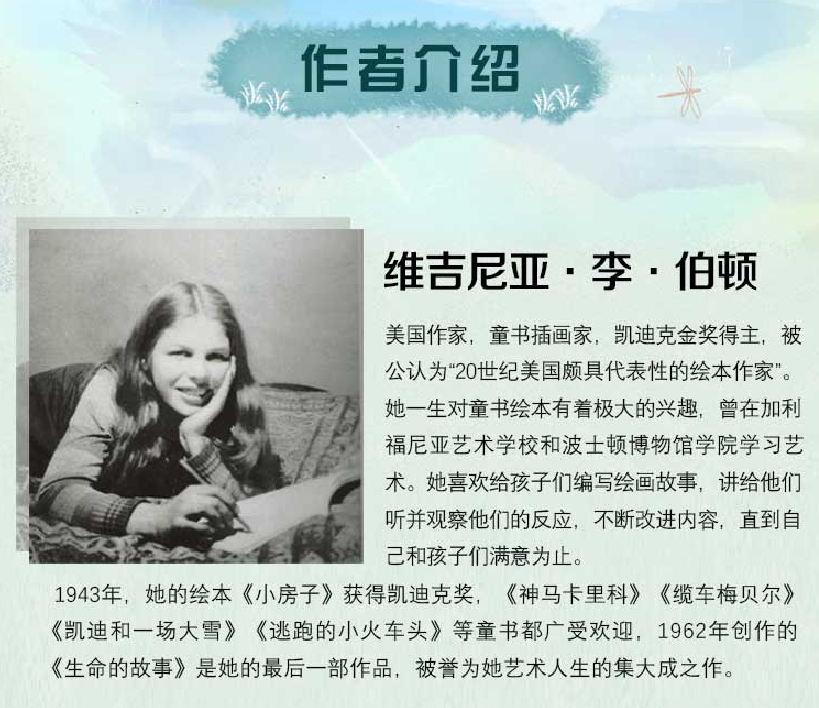 维吉尼亚·李·伯顿(Virginia Lee Burton,1909-1968年),美国作家、儿童书籍插图画家。1943年,因《小房子》(The Little House)一书获凯迪克奖。