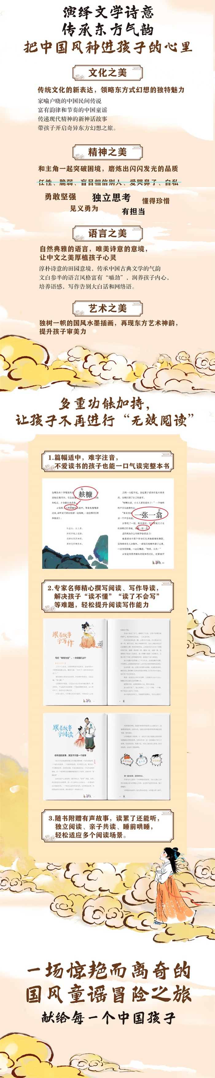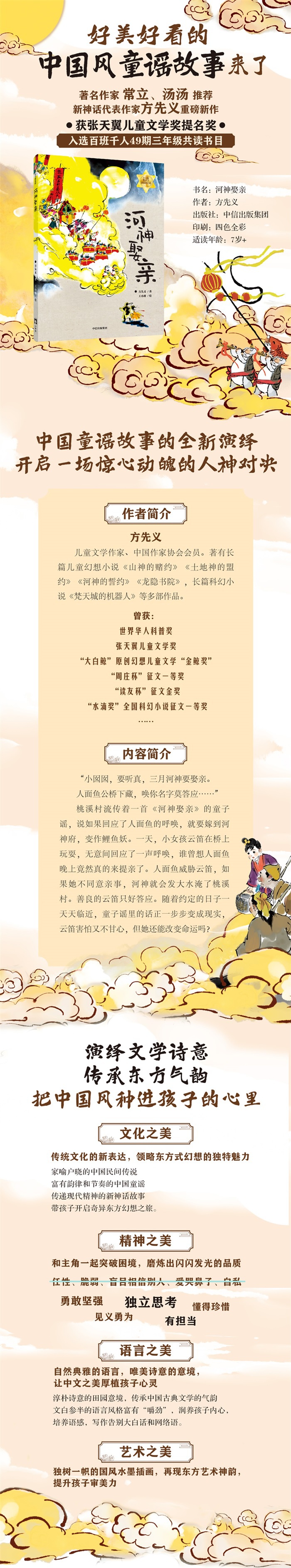 《河神娶亲》是一部让人惊艳的国风儿童文学作品,入选百班千人49期三年级共读书目,获第五届张天翼儿童文学奖。它取材于中国传统民间故事和童子谣,又加入了自己的创造,讲了一个曲折离奇的新版河神娶亲的故事,赋予传统文化新的活力。 读这本书有如品一杯清香醇厚的茶,沁人心脾,口齿留香。文中以诗意唯美的笔触勾勒了一个独具魅力的幻想世界,塑造了清新恬淡的田园意境,极具中国古典气韵。其间人们淳朴善良、互帮互助等美好品行,也极好地为读者传达了中国传统文化中的仁、义、礼、智、信等精神。故事构思巧妙,叙述节奏沉稳中不乏波澜,语言自然典雅,极富韵味。水墨风插图,清新自然,极富东方艺术特色。 该书还突破固有观念,突出人的力量,传递积极向上、勇敢独立的精神品质,同时蕴含深刻的哲理:谎言即使重复一千遍,一万遍,也抵不过真言一遍!