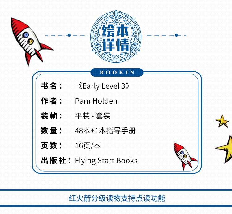 红火箭分级阅读系列从大写字母开始,从每页上只有一个词、两个词,到每页上有一句话、两句话,这种难度渐进设计,很适合非母语国家的孩子用来学习英语。它的进阶体系符合蓝思分级系统,能带着孩子通过“量”的积累实现“质”的突破。最重要的,这套书的每一级别都是故事书和科普书5:5配比,兼顾趣味性、艺术性和科学性,能让孩子在学英语的同时掌握大量的生活百科知识!………………