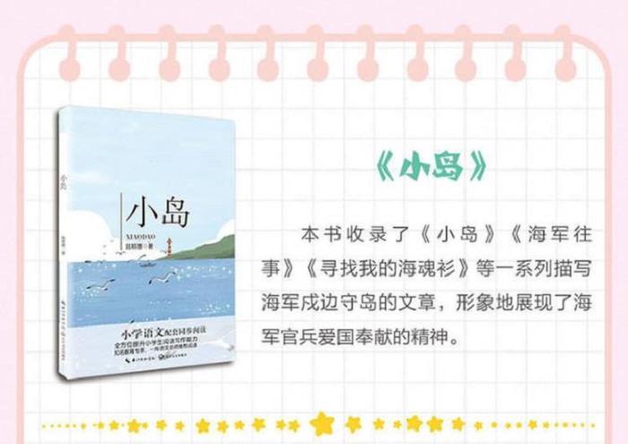 本书是陆颖墨的散文集,收录了《小岛》《海军往事》《寻找我的海魂衫》等一系列描写海军戍边守岛的文章。其作品语言浅近,海洋气息浓郁,形象地展现了海军官兵爱国奉献的精神。其中,《小岛》入选统编小学语文教科书。