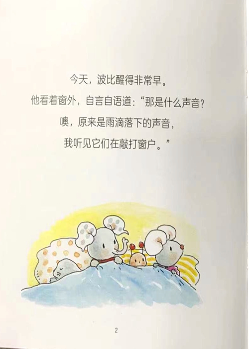 今天,波比醒得非常早。他看着窗外,自言自语道:“那是什么声音?噢,原来是雨滴落下的声音 我听见它们在敲打窗户。