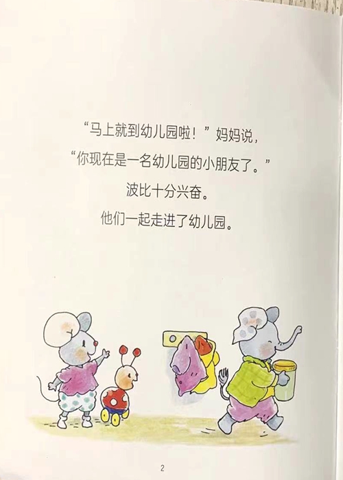 “马上就到幼儿园啦!”妈妈说 “你现在是一名幼儿园的小朋友了。 波比十分兴奋。 他们一起走进了幼儿园。