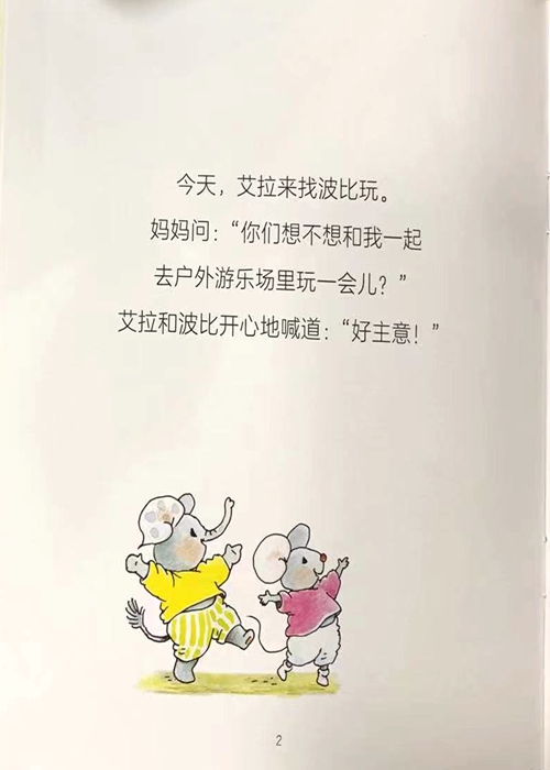 今天,艾拉来找波比玩 妈妈问:“你们想不想和我一起去户外游乐场里玩一会儿?艾拉和波比开心地喊道:“好主意!”