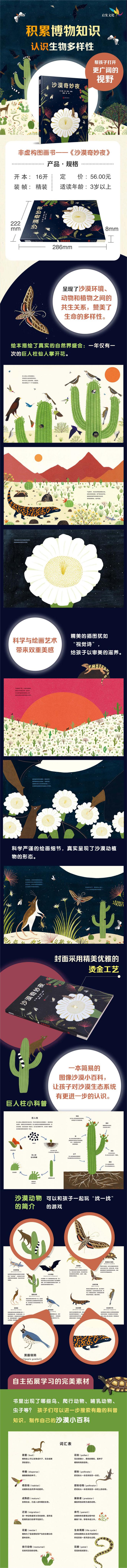 当夏日的太阳落下时,沙漠动物聚集在一起,参加一个非常特别的活动——巨人柱仙人掌即将绽放奇妙之花。宁静的沙漠在短短几个小时内变得缤纷热闹,从数里外赶来的动物都聚在一起,参与到这大自然的奇迹中来。书中探索了沙漠中不同寻常的野生动物和植物,并在书后的扩展内容做了详细介绍。 劳拉.霍桑的绘本将故事和知识完美结合,赞美了生命的多样性,以精美的图画呈现了环境、动物和植物之间的共生关系,传达了重要的生态信息:万物共生与平衡,这是大自然永恒的信仰。小读者从书中认识环境、物种、生态,看见其他不同的生命,看见人和自然的关系,学习尊重、爱惜和保护自然环境。