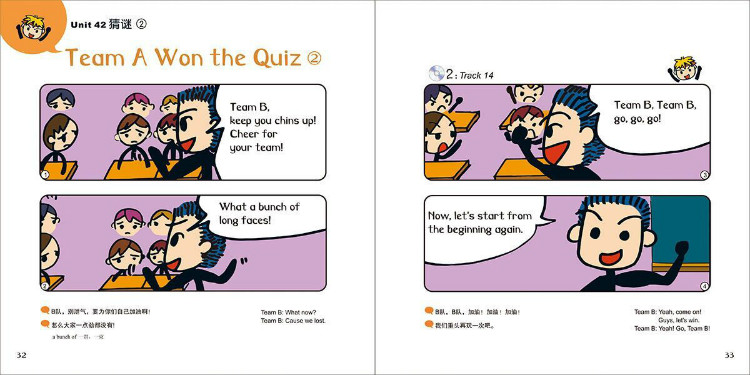 在《全班说英文》三本书中,共收录超过 150个情境对话。您可以从各册的目录中,快速地查询到自己想要了解的内容。每个单元的内容有:清楚明显的英文标题、标题中译、可爱逗趣的漫画及老师的对白,而孩子的对白则补充在漫画右下方,提供老师作为教学参考。另外,您还可在漫画左下方看到老师对白的中译,以及字词注释。而在漫画右页上方标示本单元在 CD中的节点位置