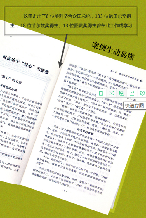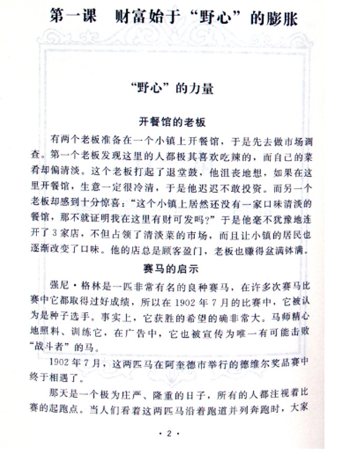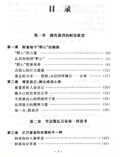 《哈佛财商课》本书以诸多寓意深刻的故事给读者朋友的心灵送上道滋补的鸡汤。内容通俗易懂,富于哲理,让你切身体会到哈佛的财商理念,犹如徜徉于哈佛大学的化殿堂;结尾处的哈佛财商测试,让你更深刻地体会哈佛财商的阐述,仿佛再次步入哈佛大学的殿堂。当然它不能直接给读者朋友们带来成功,但如果读者朋友们能藉此将自已的财商武装起来,让它爆发出巨大的能量,其意义将比任何一次具体的成功更为重大。
