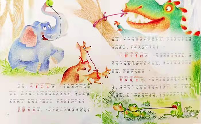 班点狗说:“艾米,把牙线一头拴在活动的牙齿上,另一头拴在飞盘上,你撇出去,我帮你捡回来,好玩又有趣,试一试吧!”