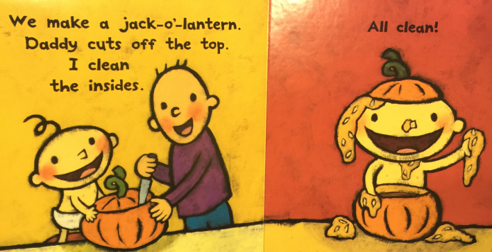 It’s almost Halloween! How should Daddy carve the pumpkin? So many expressions to choose from! What should Baby be—a princess or pirate, ballerina or clown? When the jack-o’-lantern’s ready (looking suspiciously like Baby), it’s time for a little ghost to head out in the slightly scary night. But fear turns to excitement as the pumpkin fills up with treats. WOW!