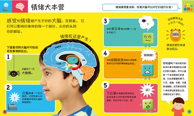 这本书延续了DK一贯的“科普”风,特色就是从科学的角度讲述每种情绪产生的原因及不同情绪对我们身体产生的影响,帮助孩子正确的认识情绪,并且用简单的方法帮孩子学会控制情绪。