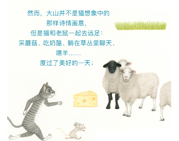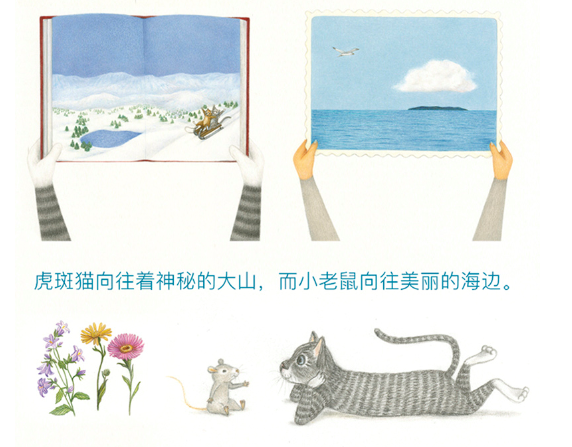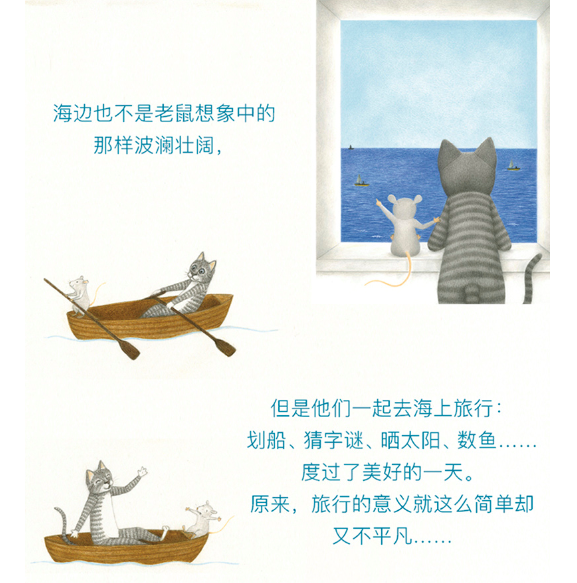 猫和老鼠相约去旅行。他们一直向往神秘的大山和美丽的海边。山里并不是猫想象中的那样,但是他们一起去远足、采蘑菇、吃三明治、躺在草丛里……度过了美好的一天。海边也不是老鼠想象中的那样,但是他们一起去海上旅行、划船、吃三明治、唱歌……度过了美好的一天。原来,旅行的意义就这么平凡而简单!