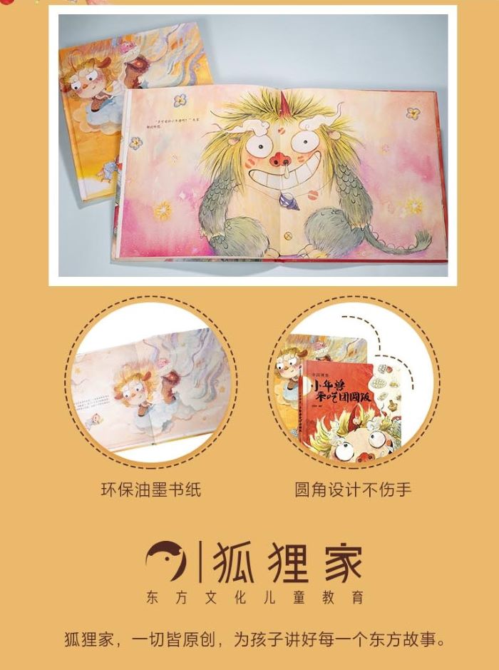 “中国神兽”系列是一套专门为小朋友创作的绘本,包括《小年兽来吃团圆饭》《麒麟送来小妹妹》。这套书将中国人耳熟能详的传说改编为适合小朋友看的全新的“中国传说”,通过萌趣的形象设计和精彩的故事情节,带领孩子了解和熟悉中国文化,让他们增强身为中国人的自豪感。