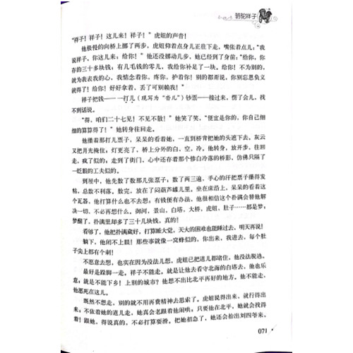 《骆驼祥子》是老舍先生的代表作之一,也是老舍自己钟爱的作品。老舍是满族正红旗人,出生在北京西城小杨家胡同的一个城市贫民家庭。他是现代著名的作家、杰出的语言大师,被誉为“人民艺术家”。《骆驼祥子》问世后蜚声文坛,标志着老舍现实主义风格的形成,达到了他小说创作的* 高成就,也是我国现代文学史上优秀的长篇小说之一,曾先后被译成十几种外文。 《骆驼祥子》主要是以北京一个人力车夫祥子为线索,祥子本来生活在农村,十八岁时跑到北京城来赚钱谋生。他咬牙苦干了三年,终于买了一辆新车。兵荒马乱的时候,他照样出去拉车。被十来个大兵捉了过去,后来趁乱混出了军营,顺手牵走了三匹骆驼。从此,他就得了一个外号,叫“骆驼祥子”。祥子在杨先生家拉包月……为了给虎妞办丧事,祥子被迫卖掉了车,所有的努力全白做了。后来小福子自杀了,从此祥子开始堕落,抽烟、耍坏、犯懒,为了赚钱用了所有阴狠坏毒的招,出卖了阮明,出卖了曹先生。成为一个好占便宜,自暴自弃的行尸走肉。在祥子的心里,什么事都是“那么回事”,有便宜他不能不占。就这样祥子成了个人主义的末路鬼。故事从祥子力图通过个人奋斗摆脱悲惨生活命运,*后失败以至于堕落,告诫人们,城市贫农要翻身做主人,单靠个人奋斗是不行的。