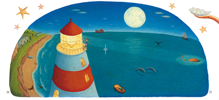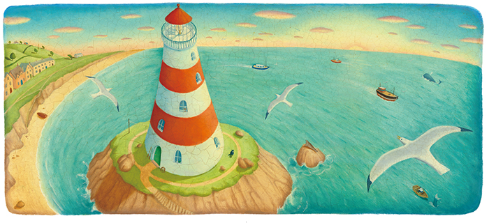 《回归蔚蓝》(2015年凯特·格林威大奖提名作品):海边有一座小镇,镇上有一座灯塔。大家每天在海边生活、工作、玩耍,其乐融融。有一天,挂起了台风,人们都躲在家里避难。等到雨过天晴,大家从家里走出来,却发现这场突如其来的台风给他们留下了一位不速之客……
