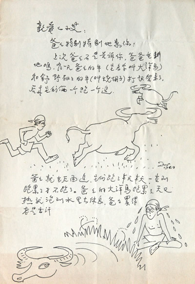 北京今秋的雨雪似乎来得特别早,窗外一直下着清冷的雨。枯坐桌前,面对丁午先生的画稿,我似乎听到他开心而苦涩的笑声。那是去年5月,我从三联书店调任人民美术出版社不久,去前门大街他的家中看望。他患癌症已大半年,正在化疗,抱歉说,只能躺着说话。我们说到人民美术出版社和美术界许多事情,说到多年前他的书稿《丁午漫画日记》曾经我手的事情,说到山东的赵镇琬、于景明,还说到沈培金、范用和丁聪,都是我和他共同的朋友。说起赵镇琬的逸闻趣事,他哈哈大笑,我也大笑。笑声充盈了那间逼仄的小屋。我们就这样一个躺着、一个坐着,说了一小时的话。那以后不过两个月,他就病危住院,进了特护病房。我去看他,正在治疗,未能进入,竟成永别。他去世后,儿子丁栋整理遗物,发现了这些1969年5月至1972年8月间,他被下放河南黄湖干校时写给留在北京的女儿小艾的信,共约六十一封,二百七十七面。1969年小艾八岁,认不了多少字,作为漫画家,他的信主要是画出来的。
