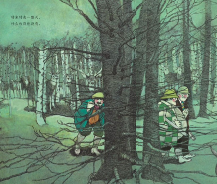 好玩的是,三个猎人他们没有注意到周围一群伪装得很不成功的动物。三个衣着整洁、不称职的猎人穿过一片幽暗的森林和一片开阔的田野,引人遐想。——书单