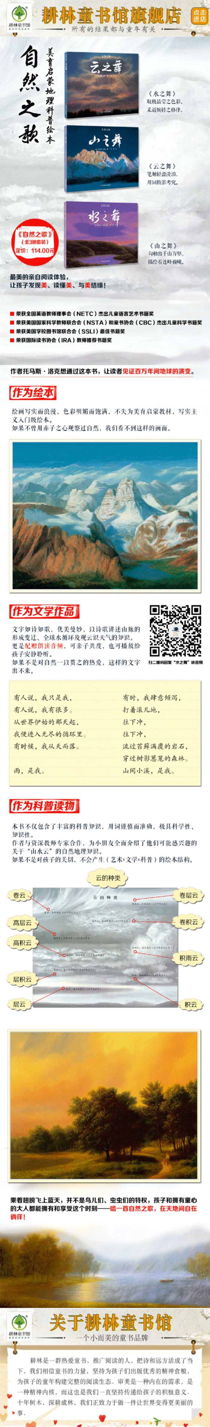 这一套畅销书,在美国广受师生好评。更是屡屡获奖,多次被学校老师列入推荐书单。作为绘本,托马斯洛克的绘画写实而浪漫,色彩明媚而饱满,不失成为美育启蒙*教材,写实主义入门级绘本;作为一套科普读物,本书的文字如诗如歌,优美曼妙,以诗歌讲述山脉的形成变迁、全球水循环及观云识天气的知识;作为一部文学作品,本书不仅包含了丰富科普知识,用词谨慎而准确,极具科学性、知识性。另外,本书更是配赠朗读音频,作为晚安绘本,可亲子共度,也可播放给孩子安静聆听。文学、艺术、科学,一书在手,一箭三雕,这也是本套书被欧美学校老师肯定,长销图书市场的原因所在。