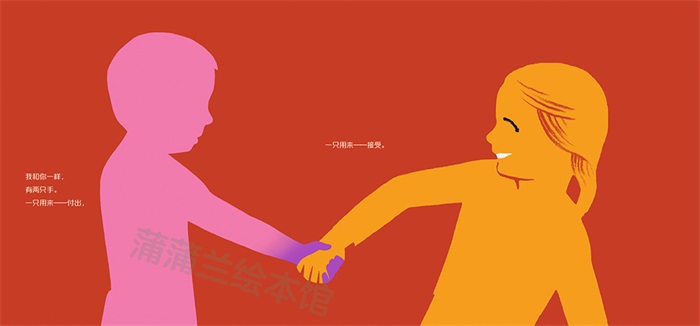“我和你一样,有两只眼睛,一只用来——看,一只用来——看见。”“看”与“看见”随着页面的展开而发生变化,巧妙的是,这个变化出现在右侧页面——这是一个折页设计,形成画面的前后对比。“看”与“看见”有何不同?在书中,我们看到,在“看”的状态下,小男孩只是看到了一个红色的圆点,而在“看见”的状态下,小男孩看到的是一个发了芽的红果子。两者之间的区别在于是否“用心看”。