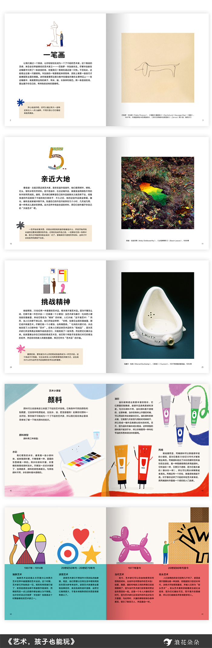 翻开书,挑战20种可以轻松模仿的创作手法。 合上书,你就掌握了N种艺术创作思维。 你也可以像毕加索、杜尚那样玩艺术, 轻轻松松地创作出自己的艺术大作! ◎ 编辑推荐 ☆ 来自艺术大师的20种创作手法,串联起现当代艺术发展历程。 立体主义、表现主义、抽象主义、超现实主义、欧普艺术、波普艺术、大地艺术、观念艺术、行为艺术……不同风格与流派的代表人物引导孩子用不同的角度观察和感知世界,变着花样地激发孩子的想象力和创作力。翻开书,挑战20种可以轻松模仿的创作手法。合上书,孩子会掌握N种艺术创作思维。 ☆ 可以玩艺术,谁要学艺术? 毕加索的绝活竟然是一笔画?有些雕塑原来没有正面?臭袜子也可以用来画画?孩子那些奇奇怪怪的梦是超现实主义画作的绝佳素材?这本书将大师的创作手法拆解成日常生活中可以轻松开启的艺术游戏。艺术不再遥不可及,孩子也可以像毕加索、杜尚那样玩艺术...