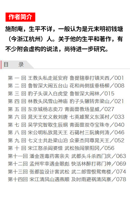北宋徽宗时期,皇帝昏庸,奸臣当道,民不聊生。故事从高俅升官说起,他为报私仇要陷害军教头王进,逐渐引出“王教头私走延安府”“鲁提辖拳打镇关西”等故事,后又陆续上演了一个个传奇英雄故事。作者通过对一百零八位英雄好汉的描写,概括了当时不同阶层的人们在封建社会中从觉醒到反抗的斗争道路。书中的英雄人物大多由于受迫害而不得不起来反抗,从而汇成狂波巨澜,奔向梁山泊。小说歌颂了农民起义们劫富济贫、除暴安良的正义行为,肯定了他们敢于造反、敢于斗争的革命精神。