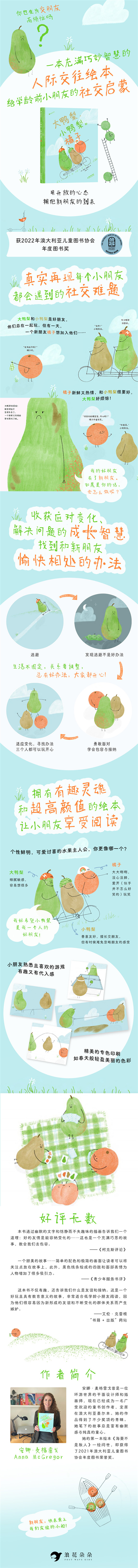 ◎获得诸多奖项认可,广受读者喜欢的“交朋友”绘本 ◎小故事里有成长大智慧!让孩子在友情中学会包容,拥有应对变化的智慧与韧性 ◎切合真实社交场景,贴近孩子心理,用平视与理解,抚慰在人际交往中敏感又退缩的孩子 ◎让人眼前一亮的水果主人公,简洁明快的画风,代入感十足的逗趣故事,让孩子享受阅读