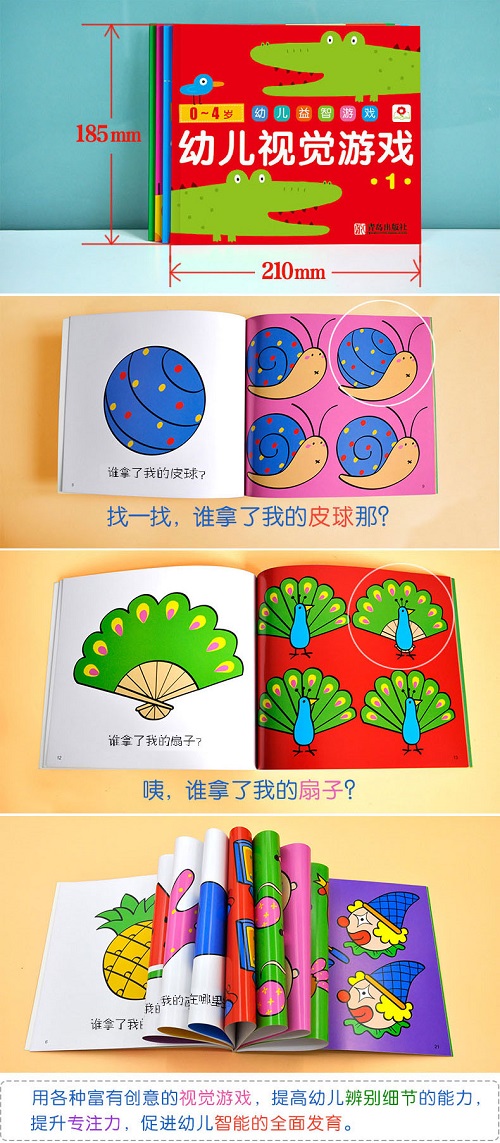 这套书色彩精美、构图简洁、内涵丰富,而且书页是比较厚的纸板,孩子不会撕破。画面有的比较抽象,有的很有联想空间。对于培养孩子的观察力和想象力非常有帮助!个人感觉,这套书里面丰富的色彩和强烈的色彩对比会深深地吸引孩子;大一点的孩子还可以引导她自由联想,看图讲故事。