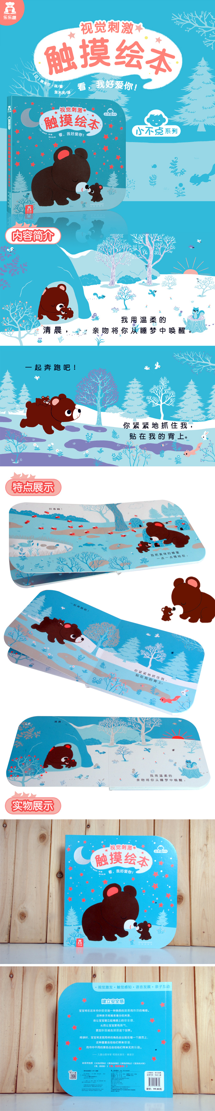书中可爱的图画和贴心的文字让宝贝们不惧怕陌生的事物,高仿真的触感设计和场景还原使宝贝仿佛置身其中,这种高还原度的感官刺激促使孩子更快更好的认知周围环境和事物,更加有效的完成对情绪、智力、意志和性格等方面的塑造,健康快乐地成长。