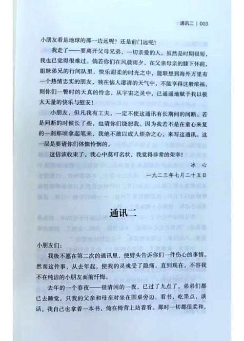 我走了一一要离开父母兄弟,一切亲爱的人。虽然是时期很短我也已觉得很难过。倘若你们在风晨雨夕,在父亲母亲的膝下怀前姐妹弟兄的行间队里,快乐甜柔的时光之中,能联想到海外万里有一个热情忠实的朋友,独在恼人凄清的天气中,不能享得这般浓福则你们一瞥时的天真的怜念,从宇宙之灵中,已遥遥地赋予我以极大无量的快乐与慰安! 小朋友,但凡我有工夫,一定不使这通讯有长期间的间断。若是间断的时候长了些,也请你们饶恕我。因为我若不是在童心来复的一刹那顷拿起笔来,我绝不敢以成人烦杂之心,来写这通讯。这层是要请你们体恤怜悯的。