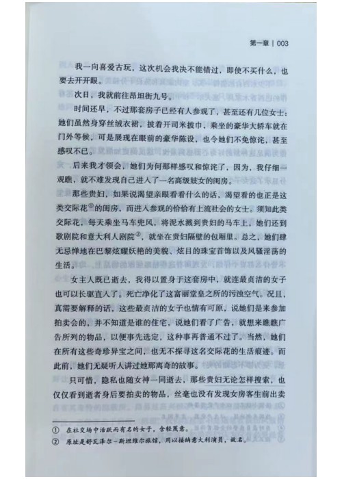 我一向喜爱古玩,这次机会我决不能错过,即使不买什么,也要去开开眼。买部 次日,我就前往昂坦街九号。 时间还早,不过那套房子已经有人参观了,甚至还有几位女士:她们虽然身穿丝绒衣裙,披着开司米披巾,乘坐的豪华大轿车就在门外等候,可是展现在眼前的豪华陈设,也令她们不免惊诧,甚至威叹不已。