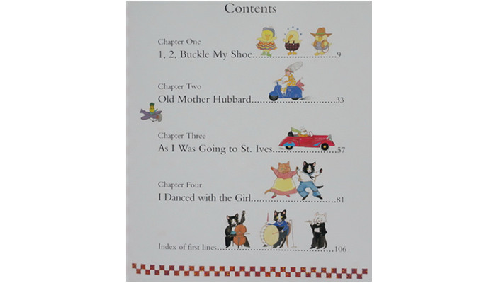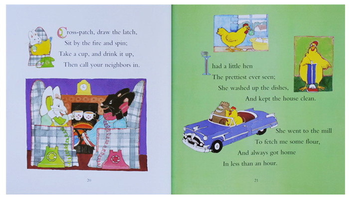 “鹅妈妈”是流传在英国各地儿歌童谣的总称。这些透过口耳相传的童谣,每一首迄今都有二、三百年的历史,总数约有二千多首,内容格外丰富。有应景应时的歌曲、有特别吸引孩子的摇篮歌、有倍受亲子欢迎的游戏学习歌、猜谜歌等等。这些童谣声韵活泼,用字遣词自由、生动,内容饶富趣味,每一首都能历经百年的考验而不衰,英国人习惯把它当作孩子读书识字过程中不可缺失的枕边教材。