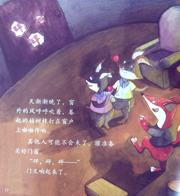 傍晚时天气阴冷起来, 朋友们还会来参加獾的晚会吗?“砰砰砰”,是熊来 了,不一会儿,“砰砰砰”,是兔子兄弟,“砰砰砰 ”,敲门声又响了……哇,如约而至的朋友越来越多 啦,算一算一共有几个人来参加了美妙的月光晚会呢 ?