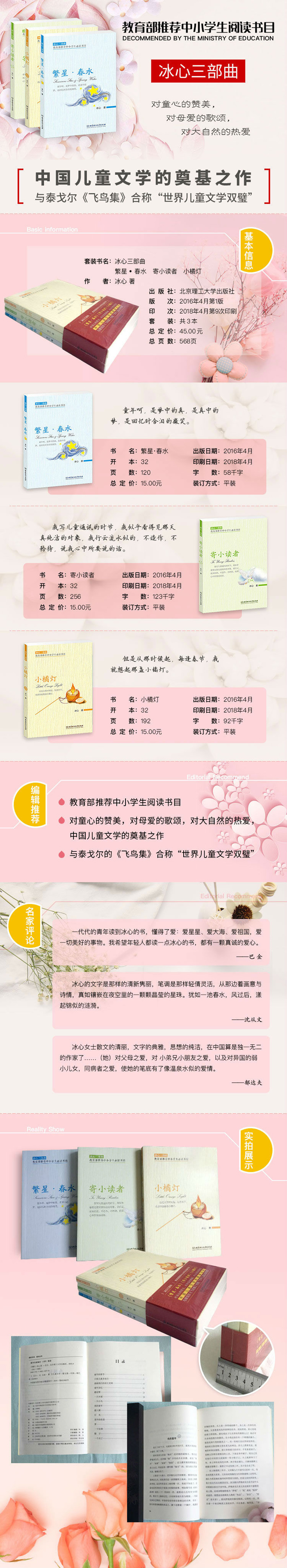 内容简介 《冰心三部曲——繁星·春水 》 《繁星·春水》是冰心女士较为得意的诗歌合集,也是人们公认冰心小诗的较高成就。《繁星》中灵动委婉、含蓄隽永的诗歌中,处处体现着冰心士的创作信仰——“有了爱,便有了一切”。《春水》中,冰心女士以歌颂亲情,赞美母爱,颂扬童心为主。她用忧愁而又温柔的笔调,诉说着心中的感受,同时也在探索着生命的意义。 《冰心三部曲——小橘灯 》 《小橘灯》是著名散文家冰心的代表作,描写十分细腻,是冰心优秀的散文之一,本书除了《小橘灯》之外还收录了作者其他著名散文作品,这些作品语言优美,内容动人,情感真挚,表达了作者对家乡的依恋之情,对儿童的关怀之情以及对生活的热爱之情。 《冰心三部曲——寄小读者》 《寄小读者》是冰心重要的代表作品,冰心女士也因此成为中国儿童文学的奠基人。20世纪60年代和70年代,冰心又分别发表了通讯集《再寄小读者》和《三寄小读者》。三部通讯集虽然发表的时间不同,但主题都是自然、童真。这样的主题恰好显现了冰心女士创作的思想内核:爱的哲学。 作者简介 冰心(1900-1999) 原名谢婉莹,福建长乐人 。中国诗人、现代作家、翻译家、儿童文学作家、社会活动家、散文家。笔名冰心取自“一片冰心在玉壶”。 1919年的《晨报》上,冰心发表了第一篇散文《二十一日听审的感想》和第一篇小说《两个家庭》;1923年出国留学前后,开始发表总名为《寄小读者》的通讯散文,成为中国儿童文学的奠基之作;1946年在日本被东京大学聘为首位外籍女教授,讲授“中国新文学”课程;1951年返回中国。1999年在北京医院逝世,享年99岁,被称为“世纪老人”。 冰心一生崇尚“爱的哲学”,歌颂童真、母爱和自然。代表作品有诗歌集《繁星》《春水》,散文集《寄小读者》《小橘灯》《樱花赞》,小说集《超人》《去国》《姑姑》,以及译著《吉檀迦利》《园丁集》《泰戈尔抒情诗选》等。 精彩书评 一代代的青年读到冰心的书,懂得了爱:爱星星、爱大海、爱祖国,爱一切美好的事物。我希望年轻人都读一点冰心的书,都有一颗真诚的爱心。 ——巴金 冰心女士散文的清丽,文字的典雅,思想的纯洁,在中国算是du一无二的作家了……(她)对父母之爱,对小弟兄小朋友之爱,以及对异国的弱小儿女,同病者之爱,使她的笔底有了像温泉水似的爱情。 ——郁达夫 冰心的文字是那样的清新隽丽,笔调是那样轻倩灵活,从那边着画意与诗情,真如镶嵌在夜空里的一颗颗晶莹的星珠。犹如一池春水,风过后,漾起锦似的涟漪。 ——沈从文