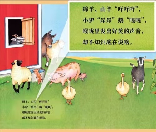 在红红大谷仓旁, 一片绿色的田野上, 有一只粉红色的小猪 在学习尖声欢唱。 那里有马儿、绵羊、山羊和鹅,还有一个快活的老稻草人,靠着锄头在出神。它们全都住在一起,就在这红红大谷仓里。费利西亚·邦德欢乐喜庆、生机勃勃的图画与玛格丽特·怀兹·布朗天真纯朴、韵律十足的文字相映成趣,描绘出农场上的一天。一大家子动物在那里平静安宁地玩耍和入睡。