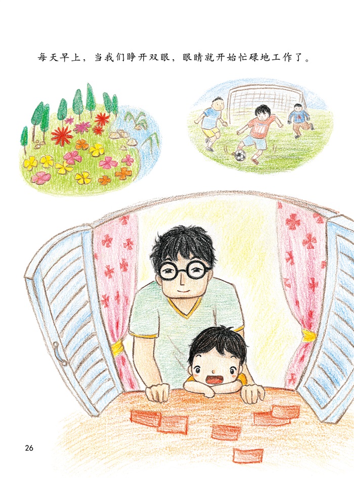 最后,爸爸讲了一个故事,谜底揭开了。原来,爸爸是因为小时候没有好好保护眼睛才导致了近视,所以才戴上了眼镜。戴眼镜可并不是一件“好玩”的事情——踩到狗的便便,吃饭时眼睛上全是雾气,运动时眼镜经常滑落……这听起来可一点儿也不“神奇”。