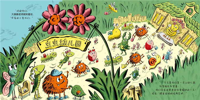 欢迎来到虫虫幼儿园!第一天上幼儿园,别害怕也别害羞。你会在这里度过快乐的一天!现在,跟爸爸妈妈再见吧。