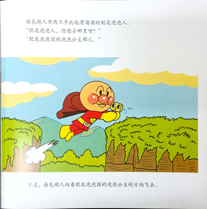 面包超人是制作面包的果酱大叔所做出的红豆面包,因刚好生命之星坠落在面包上而诞生。《面包超人和肥皂泡泡人/面包超人友情故事系列》讲述了面包超人在泡泡仙人的帮助下,打败细菌人的故事,面包超人为了能在有人需要的时候伸出援手,他开始每天都在街上巡逻,遇到肚子饿的人也会将自己的面包分给他们吃。