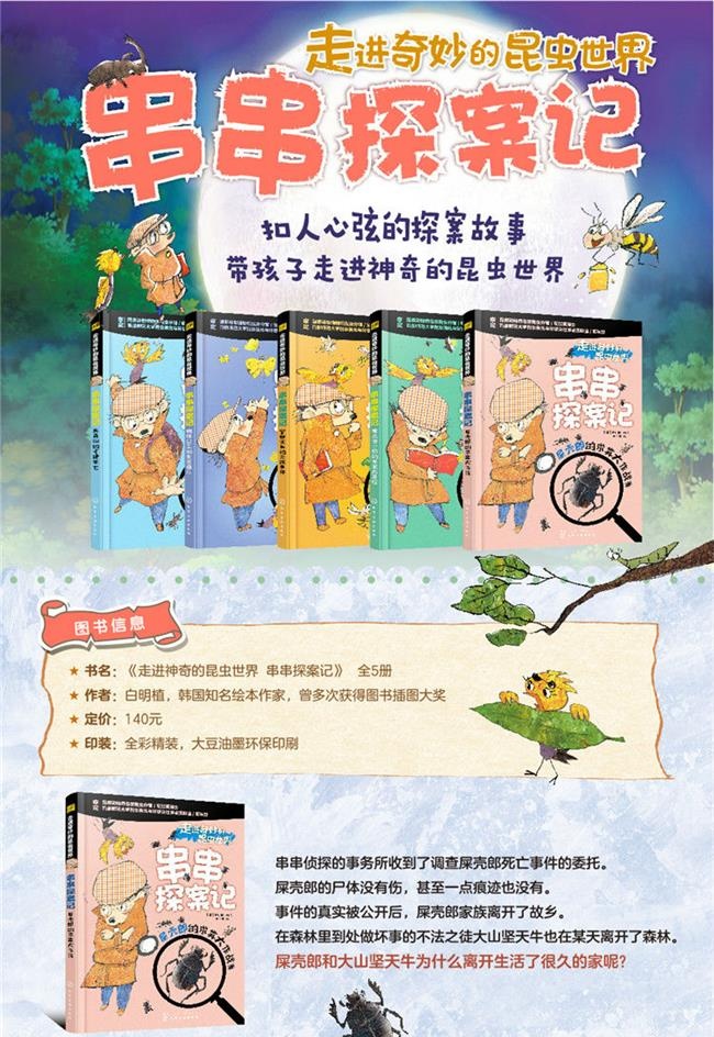 《走进奇妙的昆虫世界 串串探案记》是一套既有趣味性、知识性又富含哲的图画书。刺猬小侦探串串及鹎助手破案的形式,记录蜜蜂、蝴蝶、萤火虫、屎壳郎、独角仙等昆虫的特征、习性、繁殖、死亡……展现给小读者一个神奇、有趣的昆虫世界。既注重知识的精准,又突出创意和趣味。