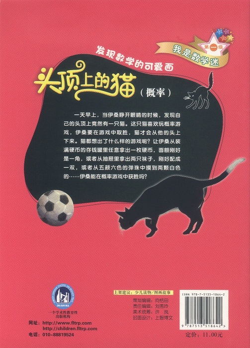 《头顶上的猫》(知识点:概率)一天早上,当伊桑睁开眼睛的时候,发现自己的头顶上竟然有一只猫。这只猫喜欢玩概率游戏,伊桑要在游戏中取胜,猫才会从他的头上下来。猫都想出了什么样的游戏呢?让伊桑从装满硬币的存钱罐里任意拿出一枚硬币,面额刚好是一角,或者从抽屉里拿出两只袜子,刚好配成一双,或者从五颜六色的弹珠中摸到两颗白色的……伊桑能在概率游戏中获胜吗?