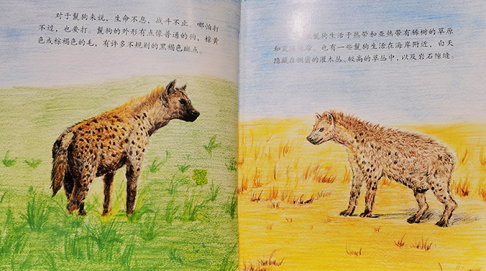 《狂野动物王国绘本》系列,原创手绘彩铅插画与科普知识完美结合,还将有音频故事,带领小朋友走进妙趣横生的动物世界,打造一场视觉与听觉的双重盛宴。具有人文气息的科普文字与栩栩如生的绘画结合,生动了介绍了非洲鬣狗的出生,捕食,交流,繁衍。