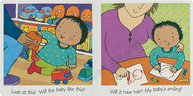 “New Baby系列的这四本书特别适合正准备迎接弟弟妹妹到来的幼儿看。这个系列涵盖的主题从孕期准备、新生儿的加入、如何和新生儿玩以及如何与新生儿一起生活这四个主题。每一个故事皆围绕多个多民族家庭展开,每个人的脸上挂着和蔼的微笑。全彩插图,文字简单明了,多为对话。内容与日常场景相似。”