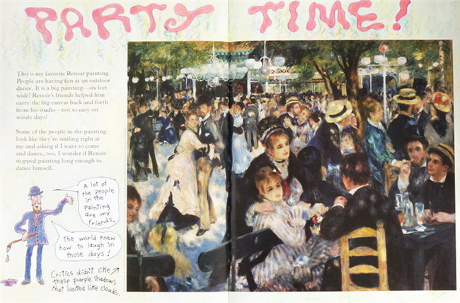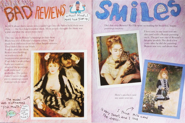 这些传记背后的故事是小学生写的关于画家的报告。每本书的开头都有一封老师“勃兰特女士”(Ms. Brandt)的来信,信中列出了学生在准备作业时可能想要思考的一些问题:你为什么选择这位艺术家;如果你可以问他或她三个问题,他们会是什么;你学到了什么让你惊讶的东西吗?不幸的是,最终的结果是混乱的页面和可能令人困惑的内容。虽然每本书都包含了主题生活的一些事实(出生日期、地点、童年、工作等),但它也包含了写报告的孩子的一些信息。例如,德加的“作者”克里斯汀在艺术家的自画像旁边放了自己的自画像。关于每个主题的材料都是严格的传记式的;没有讨论艺术家的技术或在艺术史上的地位。彩页和字体突出了许多复制品、照片、孩子般的图画和文本片段。“认识世界上最伟大的艺术家”系列(儿童)提供了坚实的事实信息和复制品。然而,如果你想通过一个虚构的人物来介绍一位艺术家,那就把读者引向克里斯蒂娜?rk的《林娜在莫奈的花园》(R & S, 1987)或尼尔·沃尔德曼的《呼吁星空》(Boyds Mills, 2001)。