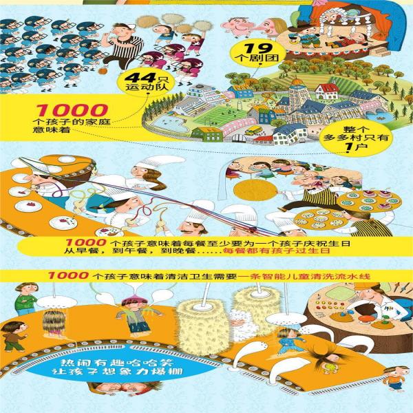 这本书有着夸张的故事情节,不同于普通家庭的两个或三个孩子,这个家庭有1000个孩子,一个村子只住着一户人家,这样的新鲜事会立刻激发孩子的想象:这会是一种什么样的家庭呢?1000个孩子的家庭是幽默爆笑的日常:世界上的名字都用光了,他们创作了稀奇古怪的名字;1000个孩子是想象力的拓展:他们有个专门的洗童房,穿着衣服进穿着衣服出就能洗得干干净净;还是好玩的数字游戏:100个浴室、200个洗手间、500个小卧室……更是让人乐此不疲的视觉大发现游戏:每个孩子身上都能看到不一样的故事:谁趴在厨师头上?谁被洗成了“小绵羊”?《家有千崽》,让想象力和笑声齐飞!
