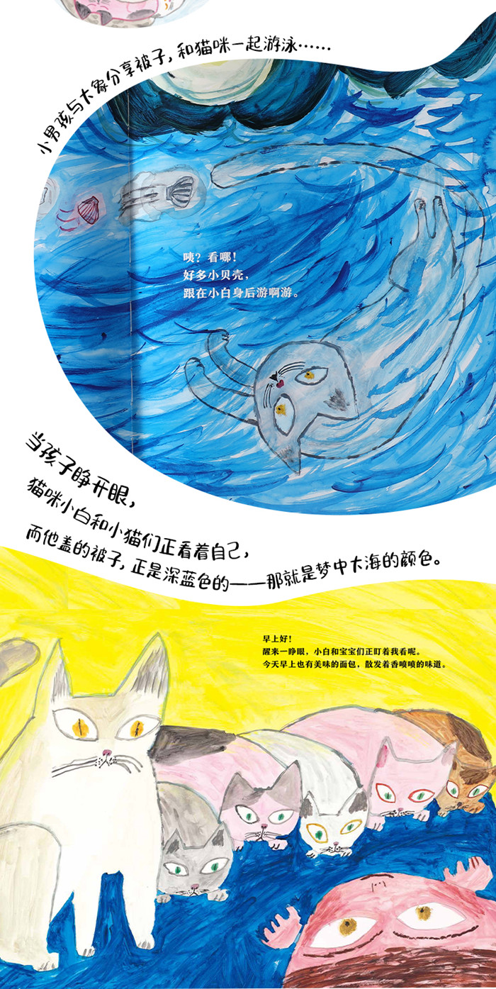 在梦境中,大海、猫咪、面包都变成了孩子的被子。他与大象分享被子,和猫咪一起游泳……这梦从大海和游泳开始,最后又归到大海和游泳,当孩子睁开眼,猫咪小白和小猫们正看着自己,而他盖的被子,正是深蓝色的——那就是梦中大海的颜色。