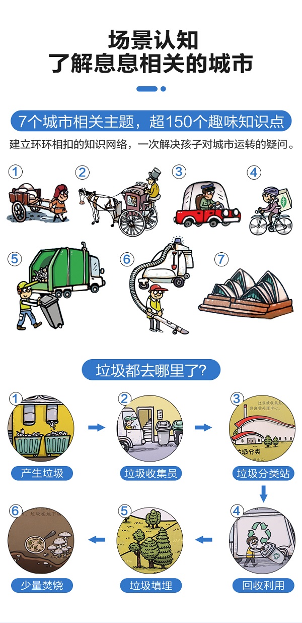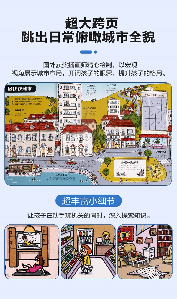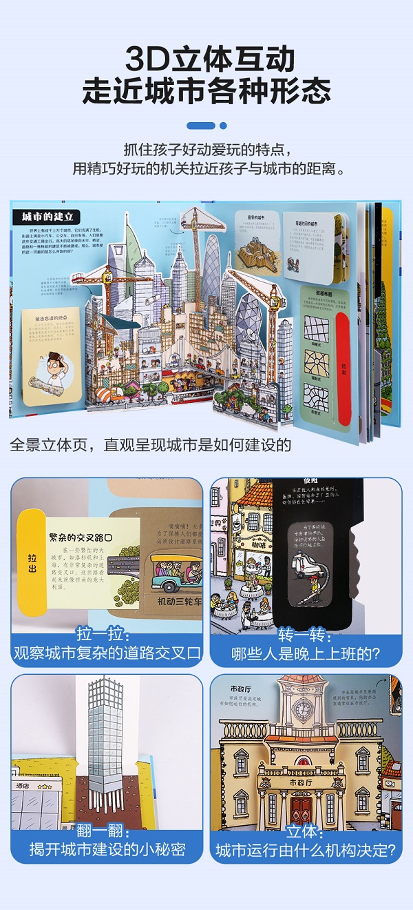 这是一本面向儿童的科普立体书,书中通过精美的插画、大量的翻翻页、有趣的小转盘和精巧的小立体,介绍与城市相关的知识,小读者可以从书中了解城市是怎么建立的、城市是如何运转的、城市里的住宅有哪些类型、城市里人们的出行方式有哪些等,让孩子更加详细地了解自己居住的城市和城市里的生活。